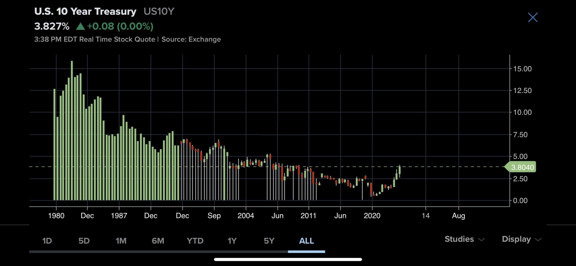Back in June of this year, though, this trend was most certainly broken. From a charting perspective, we saw what is known as a “double-top” in the very low 3% range (first in late 2013 and then in mid-2018). We hit the yield in the low 3s again in May of this year, tripling down. After briefly backing off, this June brought the yield up to about 3.5%. What we are witnessing now is a significant break-out and rates are breaking out of a trend-line that ran a certain way for nearly 40 years! The yield was closing in on 4% earlier this month. There’s currently no ceiling related to how high rates can go in the future.